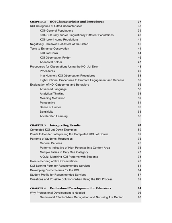 The KOI documents the myriad of ways students manifest giftedness in similar learning environments with hundreds of effective learning experiences and techniques that integrate curriculum to support, nurture, and document talents. The KOI enables educators to enrich the learning environment for all learners while identifying gifted and talented students.