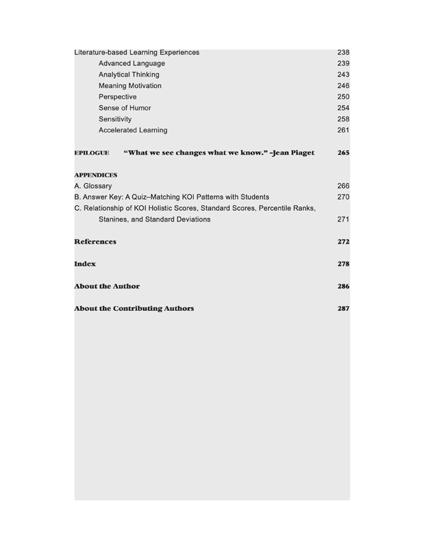 The KOI documents the myriad of ways students manifest giftedness in similar learning environments with hundreds of effective learning experiences and techniques that integrate curriculum to support, nurture, and document talents. The KOI enables educators to enrich the learning environment for all learners while identifying gifted and talented students.