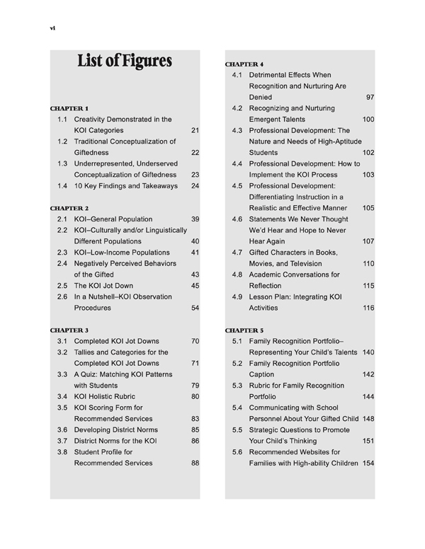 The KOI documents the myriad of ways students manifest giftedness in similar learning environments with hundreds of effective learning experiences and techniques that integrate curriculum to support, nurture, and document talents. The KOI enables educators to enrich the learning environment for all learners while identifying gifted and talented students.
