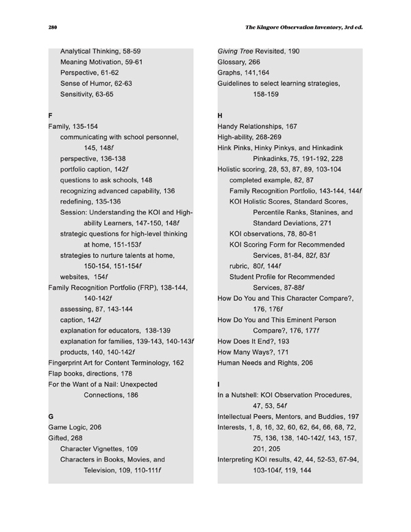 The KOI documents the myriad of ways students manifest giftedness in similar learning environments with hundreds of effective learning experiences and techniques that integrate curriculum to support, nurture, and document talents. The KOI enables educators to enrich the learning environment for all learners while identifying gifted and talented students.
