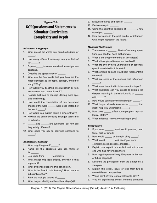 This process also helps teachers immediately initiate appropriate differentiation in the classroom. The KOI enables educators to enrich the learning environment for all learners while identifying gifted and talented students.