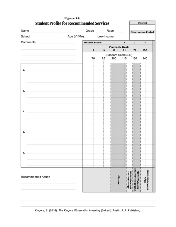 The Kingore Observation Inventory (KOI) screens and identifies students through seven observable characteristics of giftedness and high aptitude that apply to all learners, including low-income, linguistically-diverse, and culturally-diverse populations. With two levels, K-3 and 4-8, the KOI characteristics are: