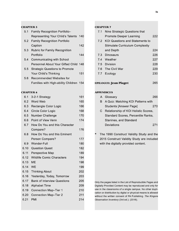 The KOI documents the myriad of ways students manifest giftedness in similar learning environments with hundreds of effective learning experiences and techniques that integrate curriculum to support, nurture, and document talents. The KOI enables educators to enrich the learning environment for all learners while identifying gifted and talented students.